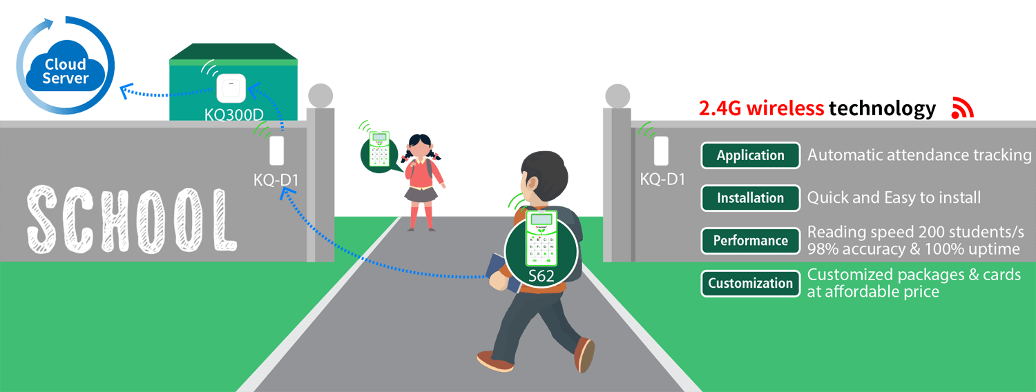 • When a student wears a RFID tags (cards or wristbands) and moves within or around the site where is covered by the Sub-Readers, the unique ID of tags are read by the Sub-Reader which wirelessly transmit the ID of the tags to a central RFID Reader.