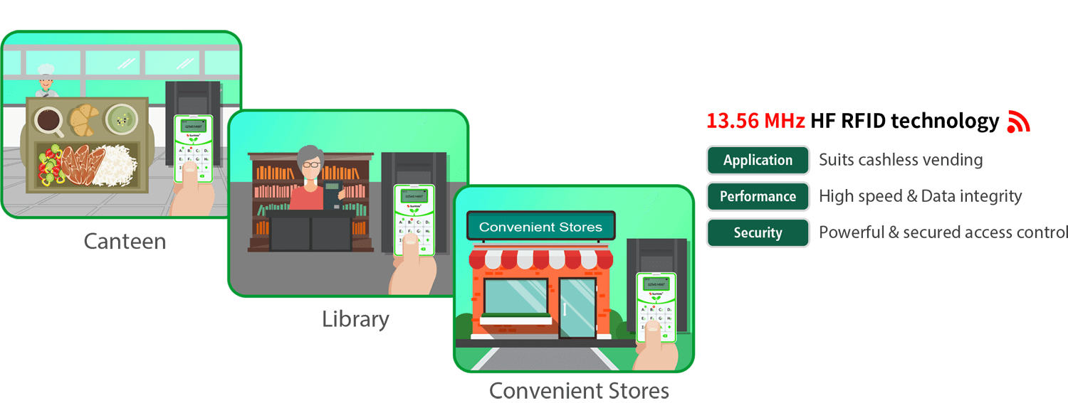 • Students wear their 13.56 MHz RFID Tags and touch their smart cards with the fixed RFID scanners or portals to mark their consumption.