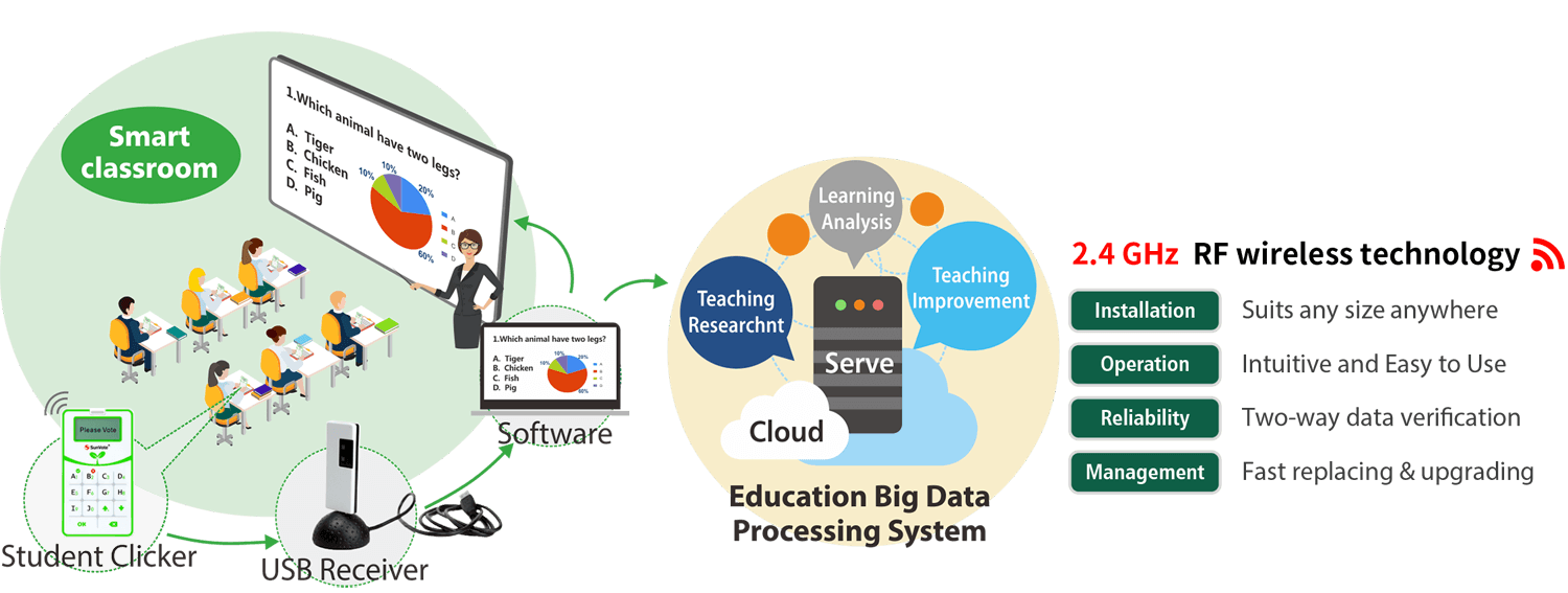 Integrating SunVote Student Response Clickers & Receiver based on 2.4G RF technology to your Students Response Systems or Classroom Response Systems which can work with whiteboards or computers installed MS PowerPoint. Every classroom is mounted with a 2.4G RF Receiver. Students carry their associated clicker to attend classes. The teacher can enable the system in their computer, to engage and empower students of any size by organizing Quick Quiz, Easy Tests and Fun Contests, etc., real time feedback and post-session reports could help the teacher to increase student engagement and assess student knowledge.
